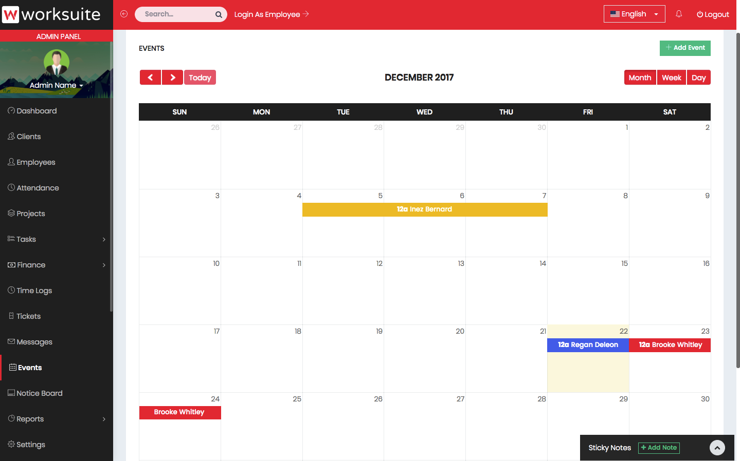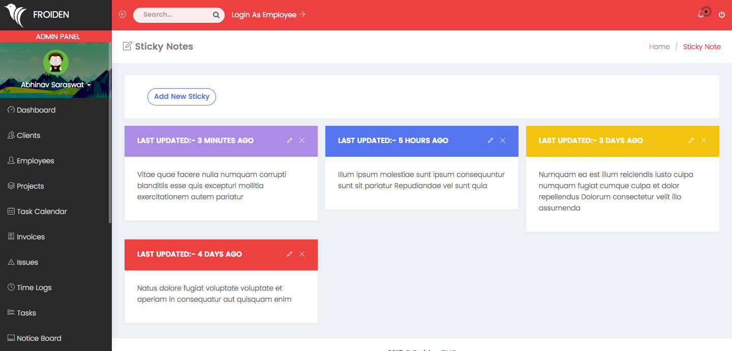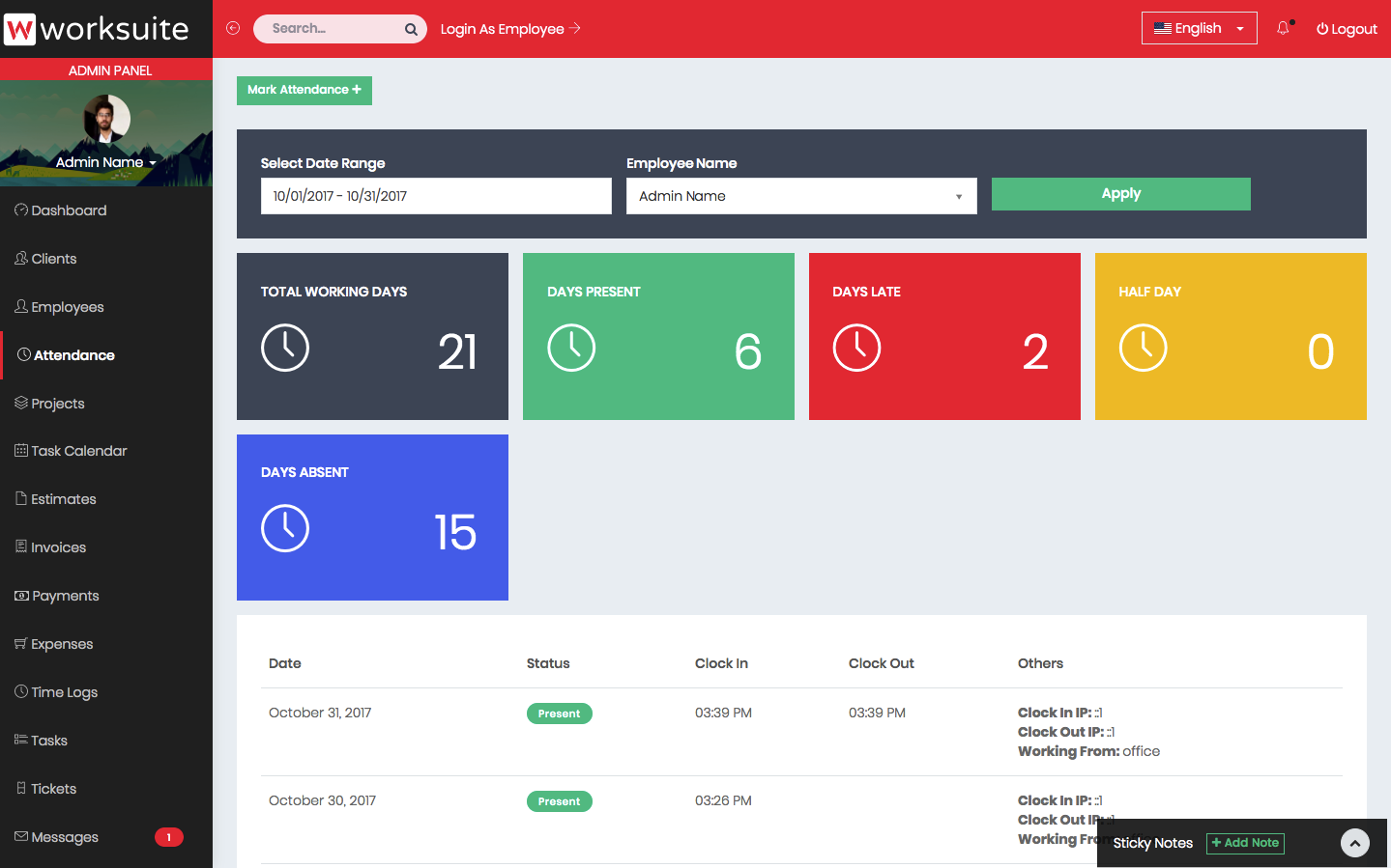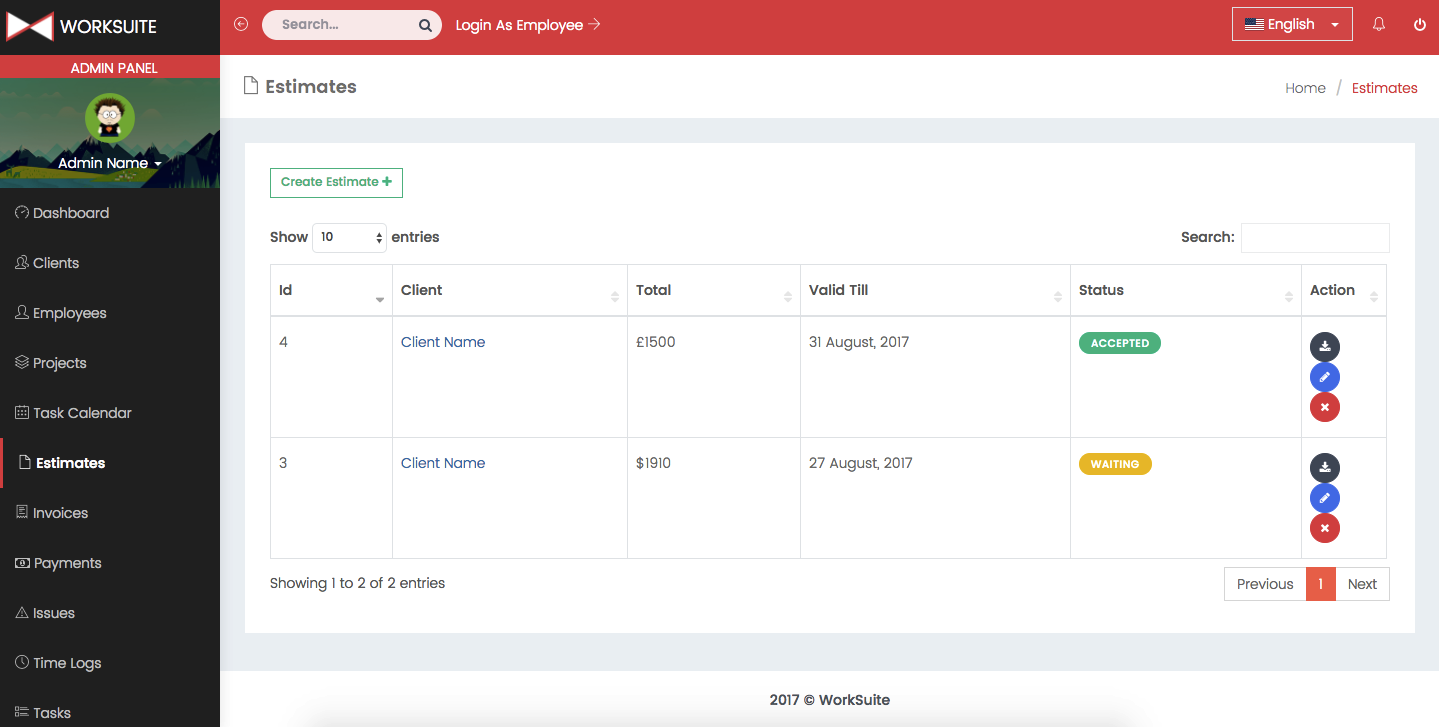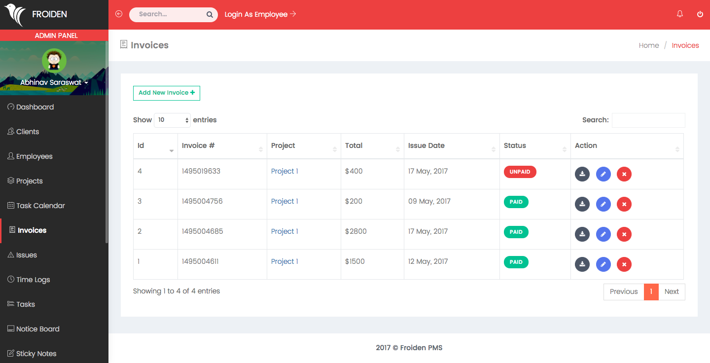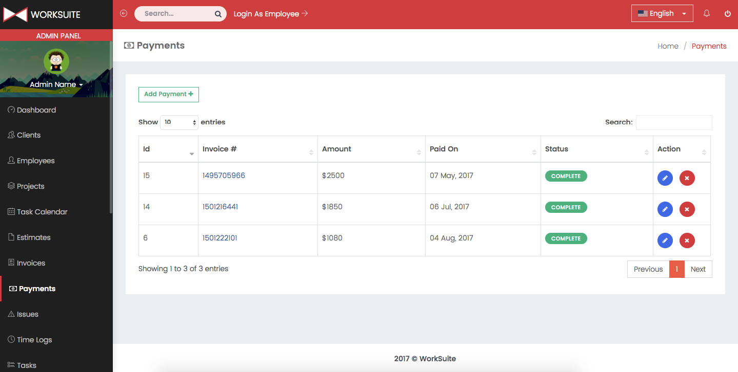 Admin dashboard shows important information about your projects, payments, clients and employees.