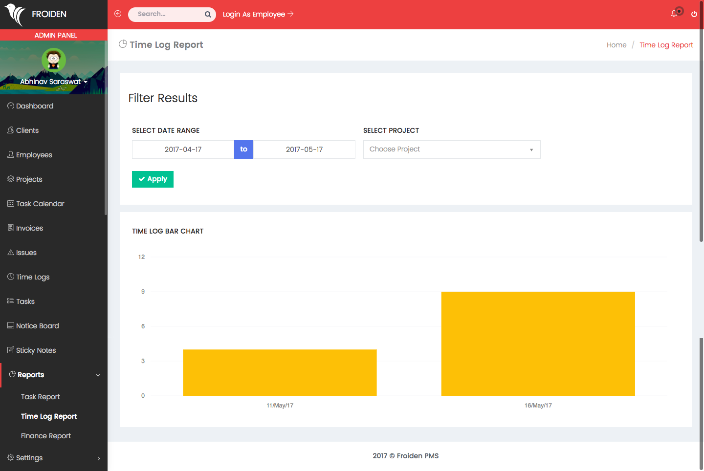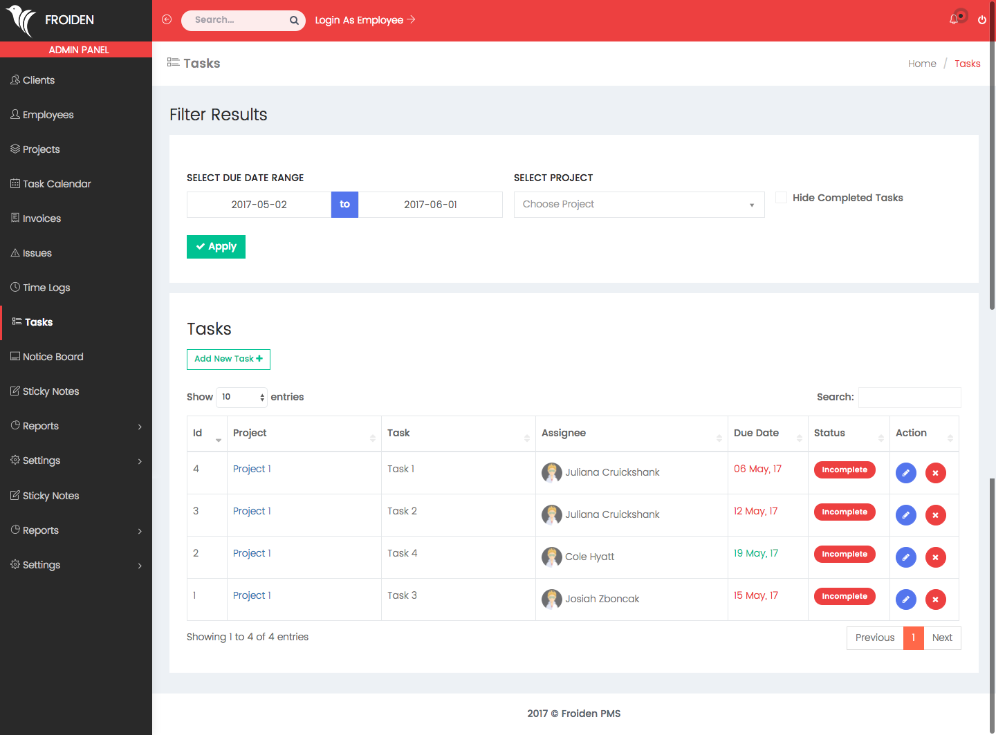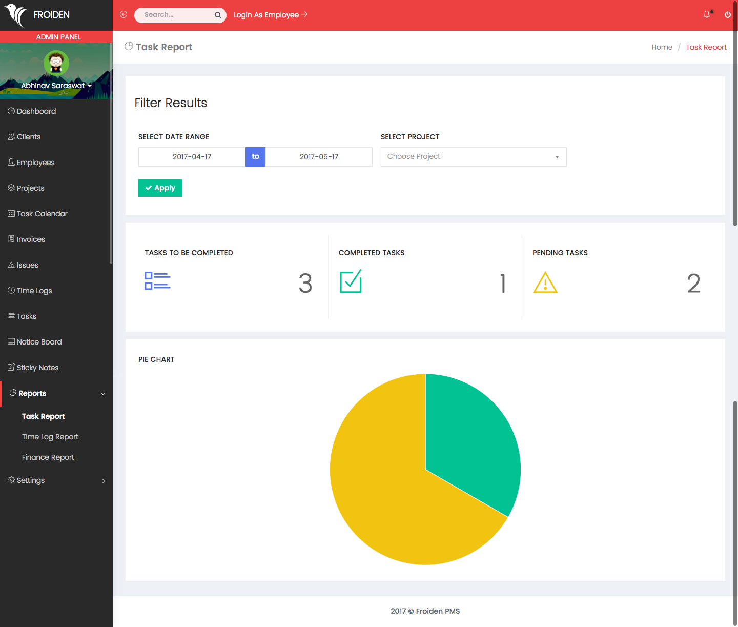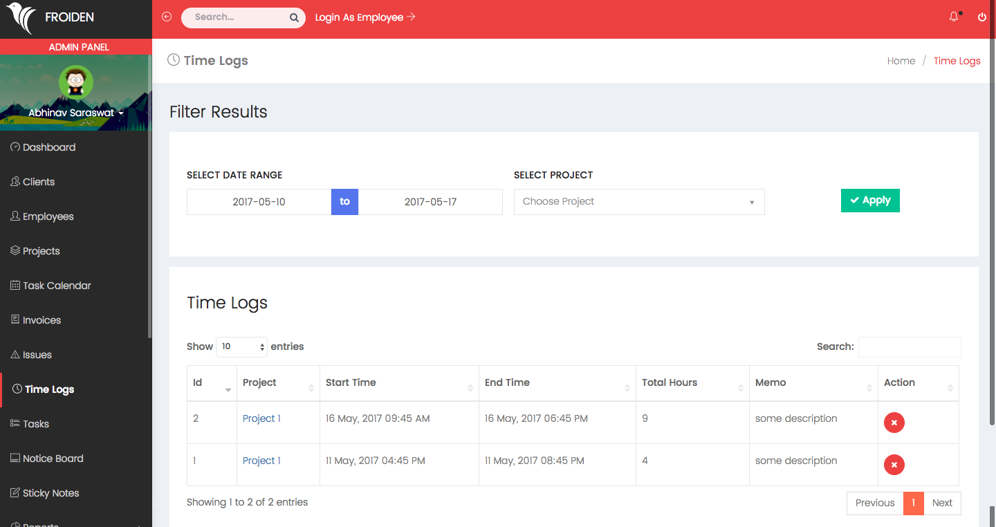 It shows the list of all the tasks which you created for your employees. You can filter the results by date range and for a particular project.