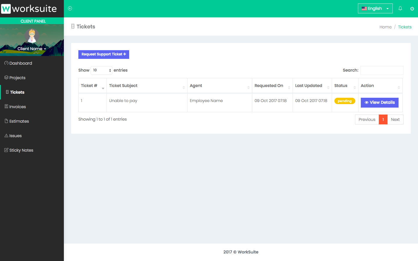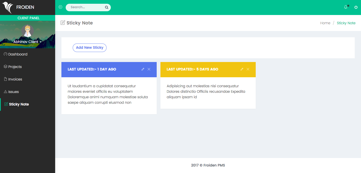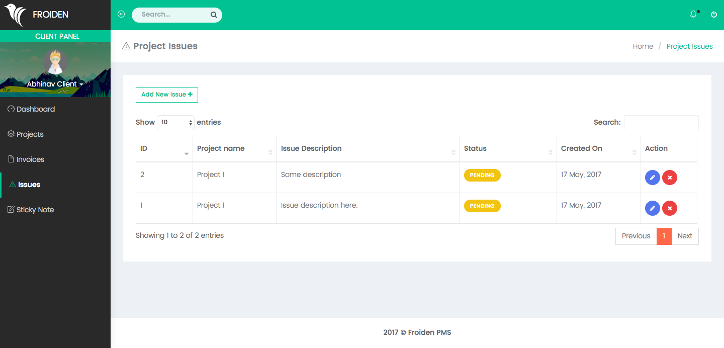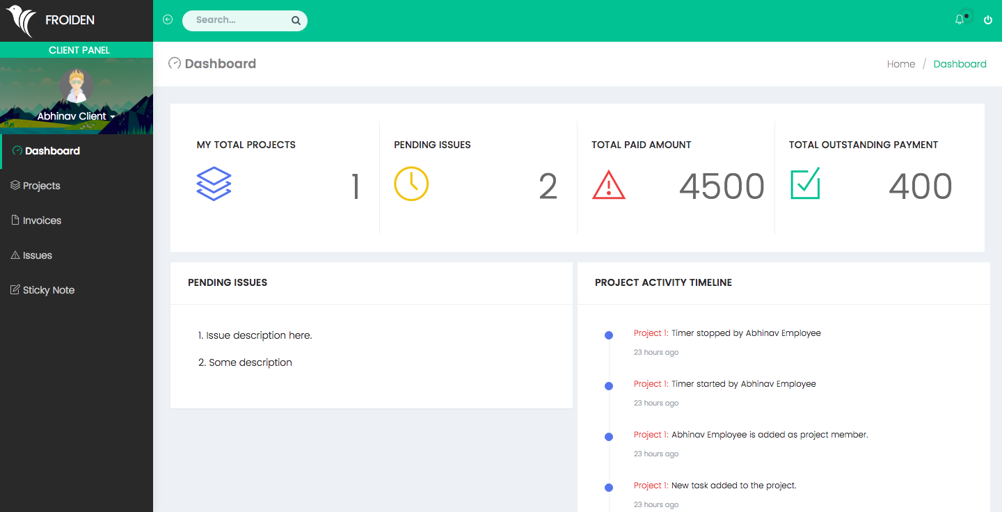 Client dashboard shows important information about client projects, issues, and payments.