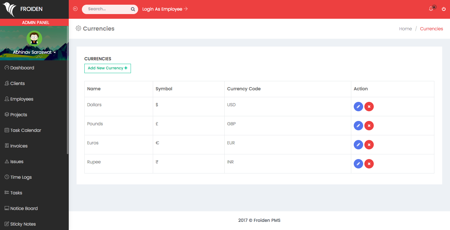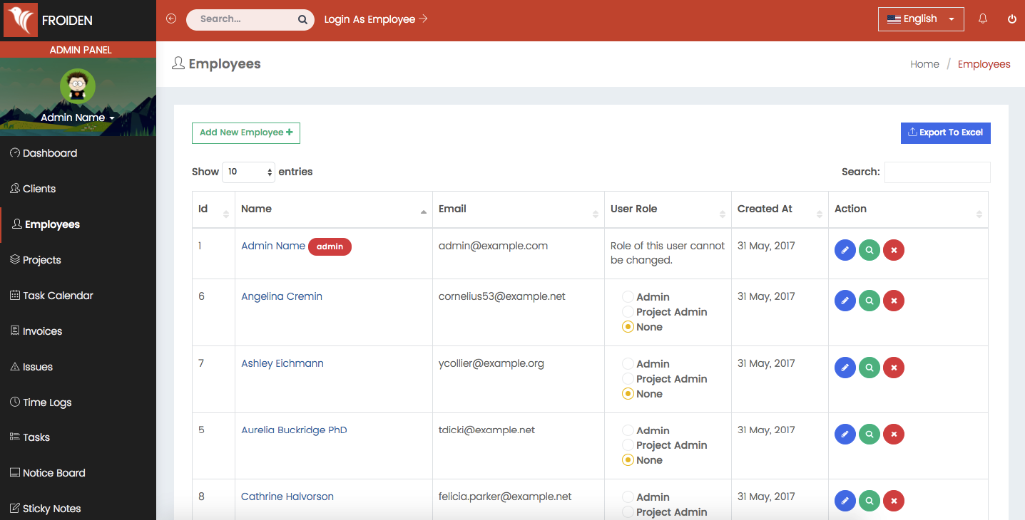 This section shows the list of all employees in your company. You can see the details related to the employee by click on the employee name. You can also change the roles of the users from this table.