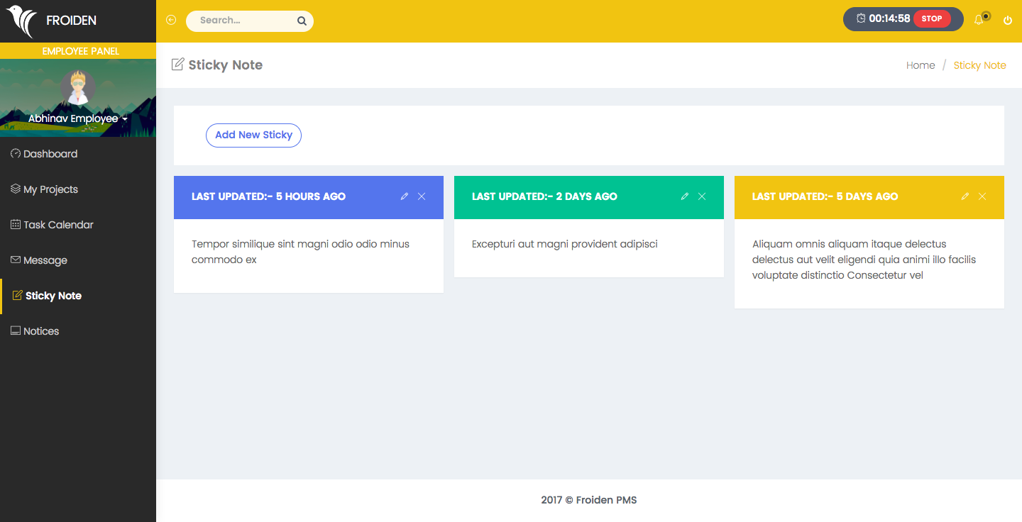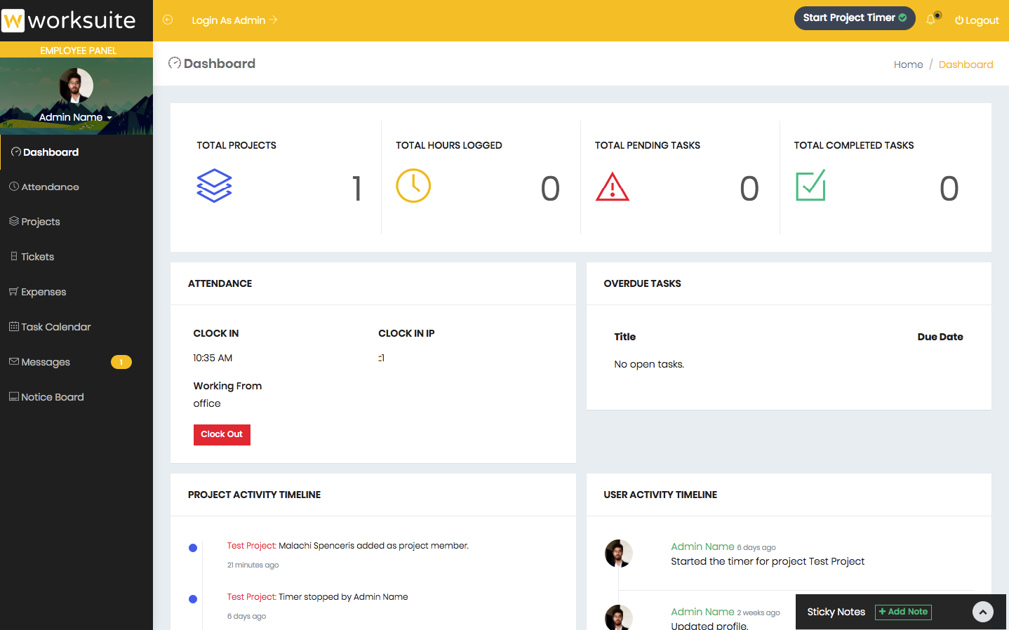 Employee dashboard shows important information about employee's projects, tasks, and time logs.