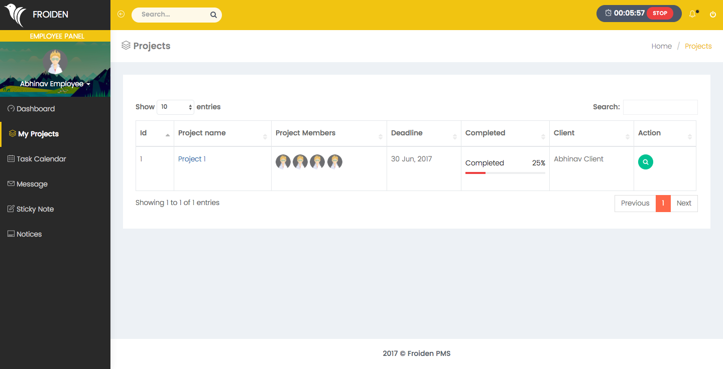 It shows the list of projects on which employee is working on. An employee can view the details by clicking on the project name.