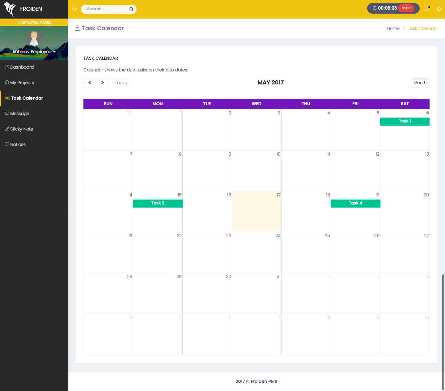 It shows all the tasks which an employee has been assigned on a calendar according to their due dates.