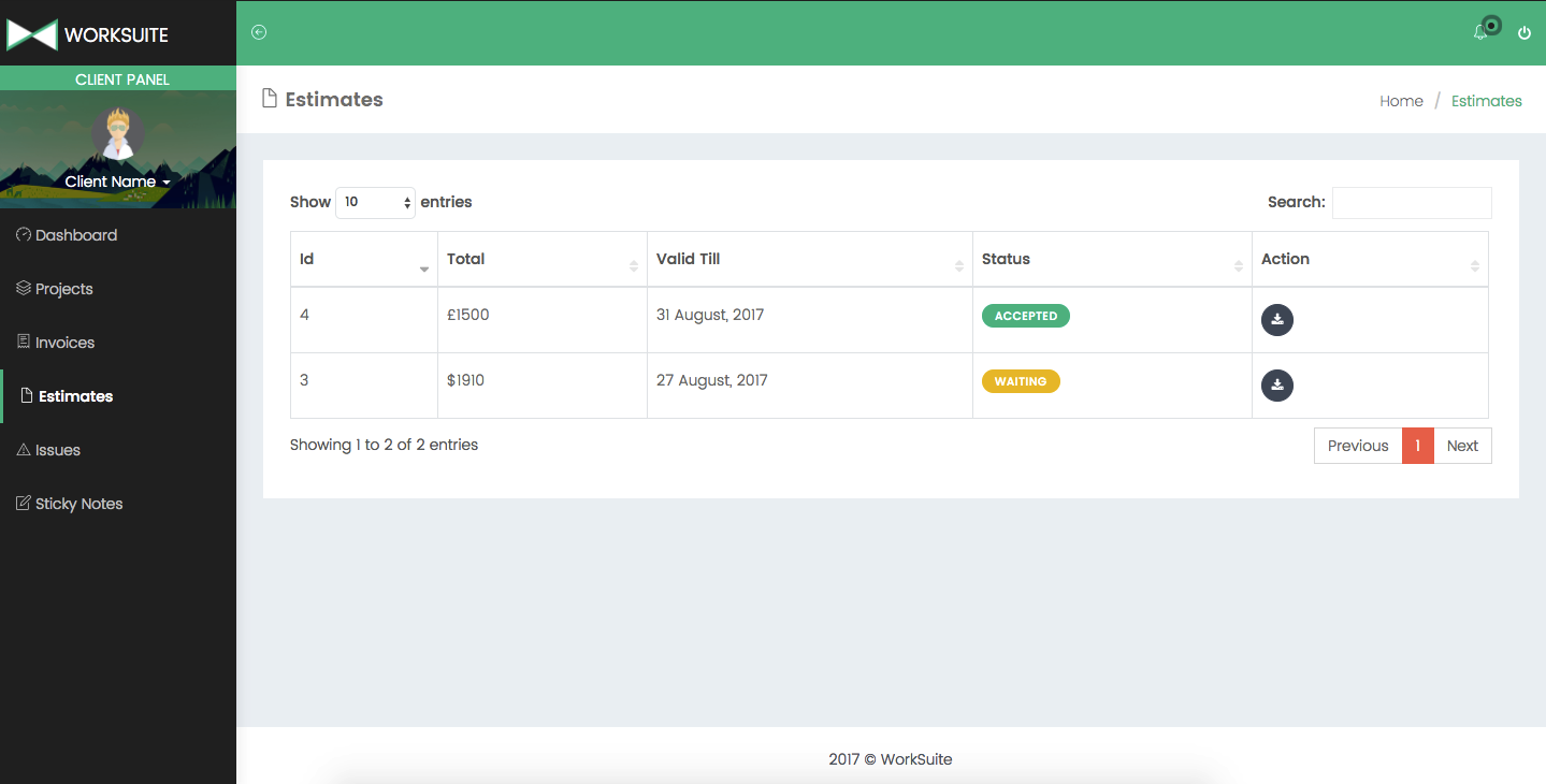 You can generate estimates/quotations for your clients. The estimate will be visible to client in their panel.
