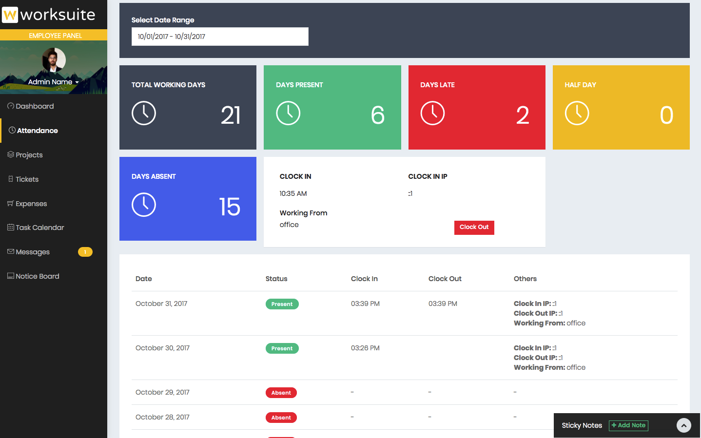 Employee dashboard shows his attendance details for a date range.
