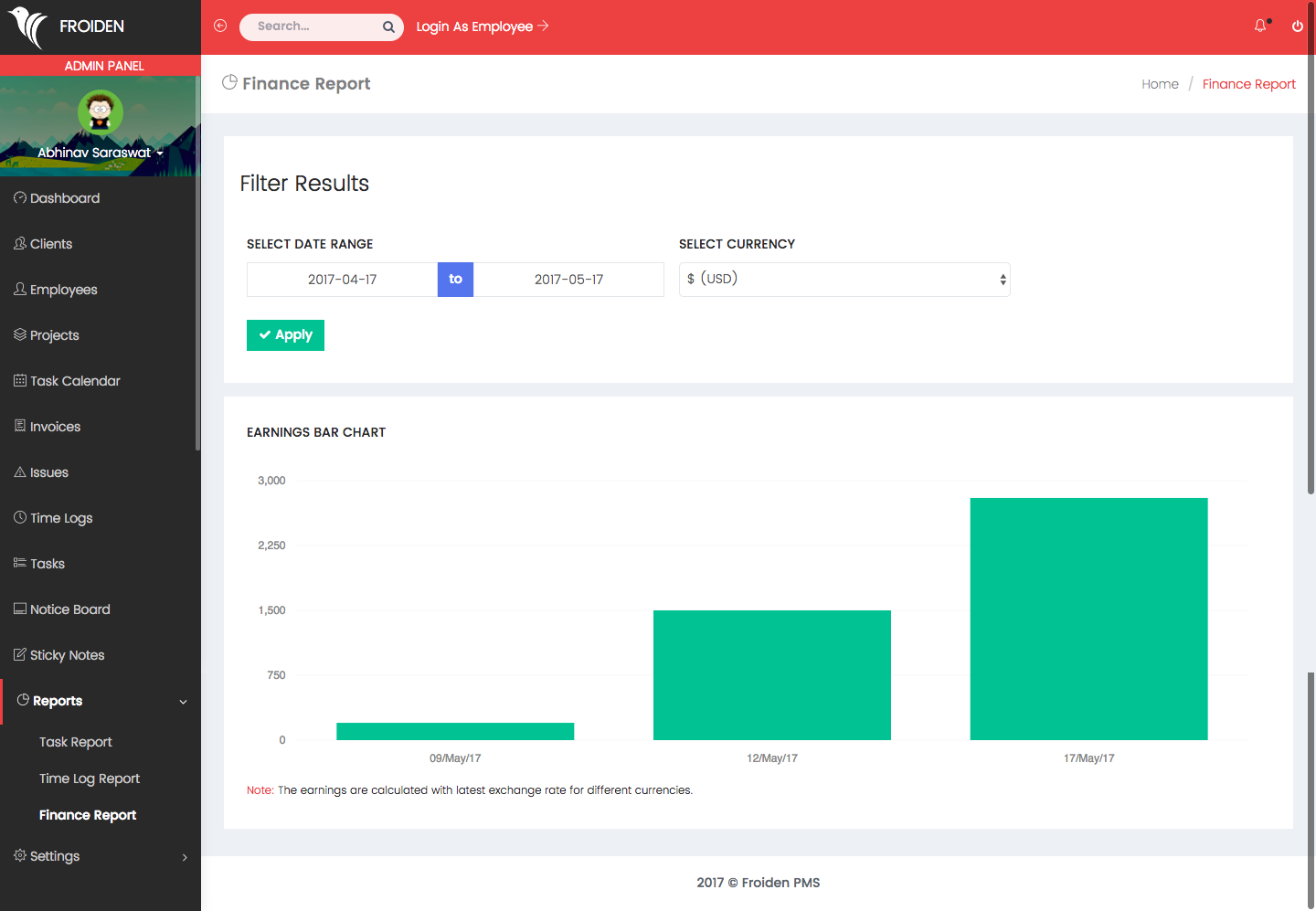 It shows the date wise earning you have earned. It gets the amount from paid invoices and shows the amount in your base currency (can be changed in settings).